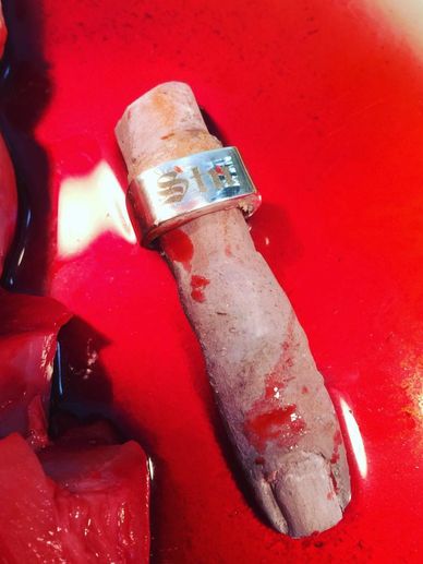 Above a prop I made: Finger carved from a carrot and painted for episode 1.